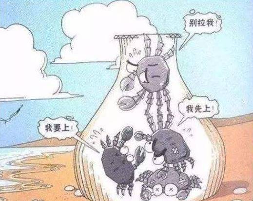 在竹簍里放一群螃蟹后,螃蟹就互相拉扯,就算有一只勇猛的螃蟹爬到了邊沿,也會被扯回來。